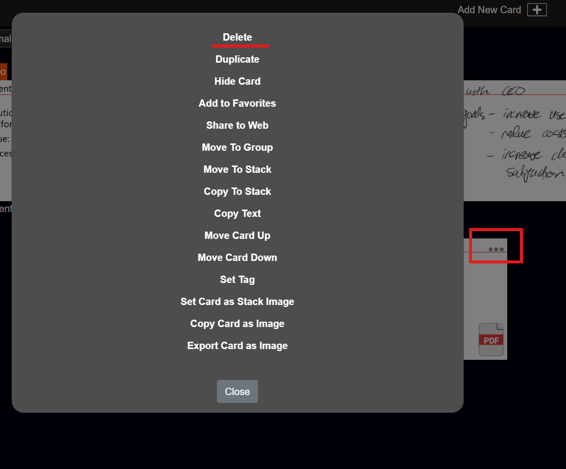You can also open the menu in the thumbnail view of Cards - and a popup will appear