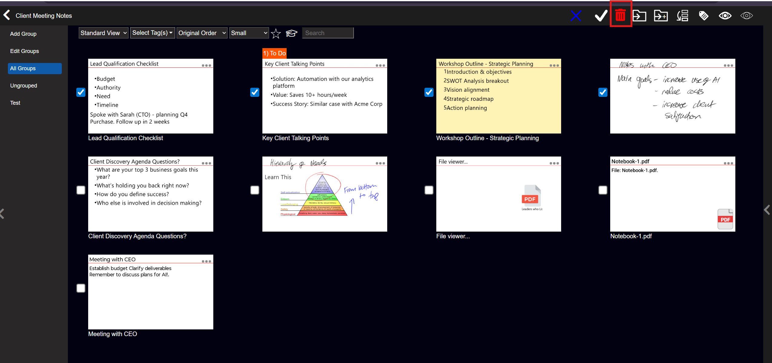 Note: the white 'Tick Checkbox' icon to the left is the 'Select All' option - to quickly select all the Cards.