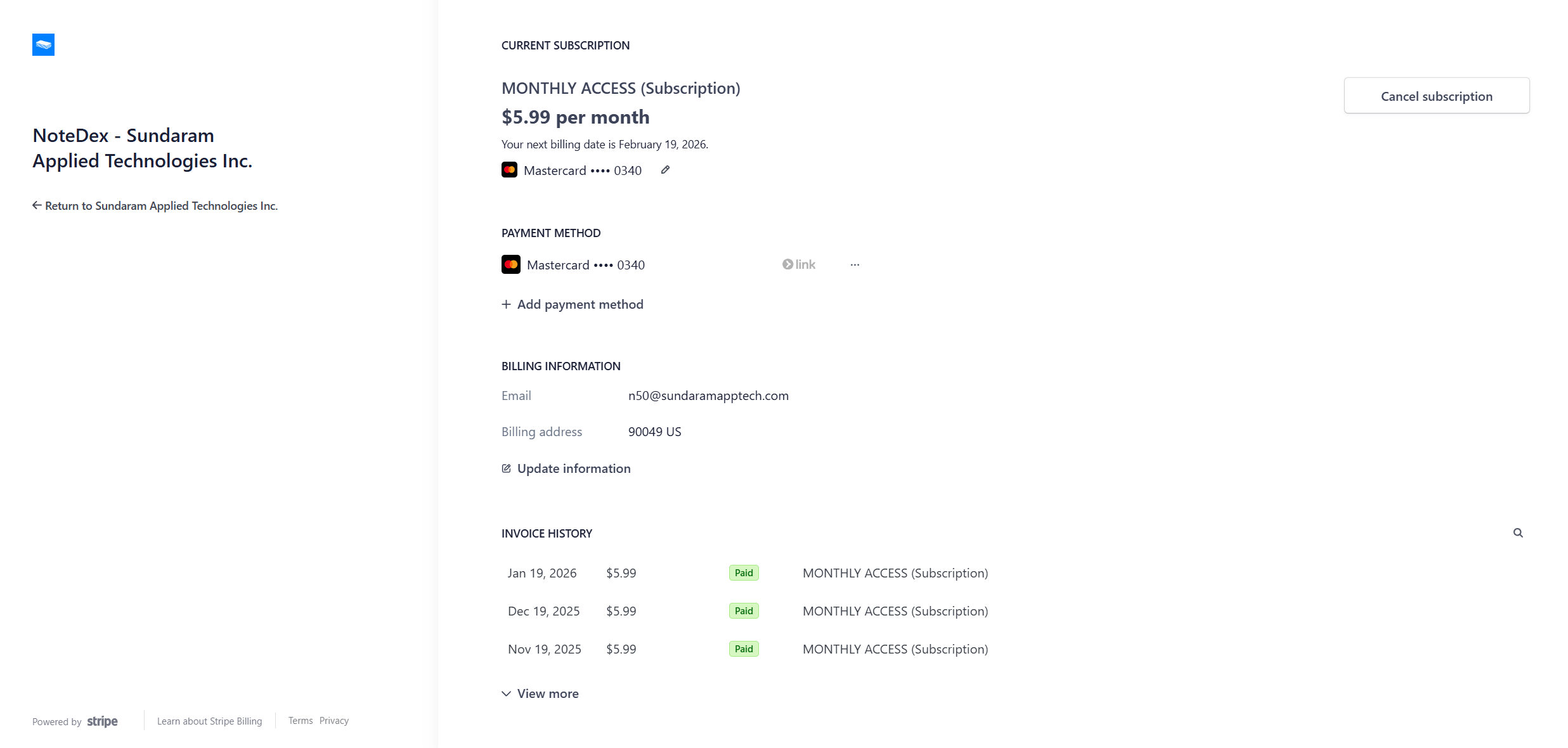 For Windows and Web users we utilize the Stripe payment system to manage your subscription. When you go through the Purchase screens in NoteDex you will be utilizing the Stripe payment mechanism to complete your order. Once you have done this you will billed monthly or annually until you cancel your subscription.